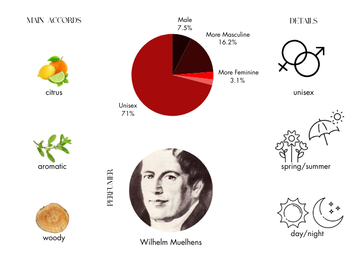 4711 Cologne by Muelhens, Originally named Eau de Cologne when it was created, 4711 was the handiwork of Johann Maria Farina before he sold the rights and licenses to the design house of Muelhens in 1792. The fragrance is described as a refined fruity aroma intended to refresh the senses rather than leaving a strong perfume-filled trail. Opening this fragrance are citrus top notes of lemon, orange and grapefruit combined with bergamot. A hint of floral middle notes of rose and rosemary softens the blend backed up by strong base notes of sandalwood, musk, neroli, and petitgrain.