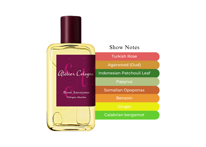 Fragarance notes are Bergamot from Calabria, Ginger from China, Turkish Rose Essence, Turkish Rose Absolue, Incense From Somalia, Velvet Oud Accord, Patchouli from Indonesia, Papyrus from India, and Benjoin from Laos.