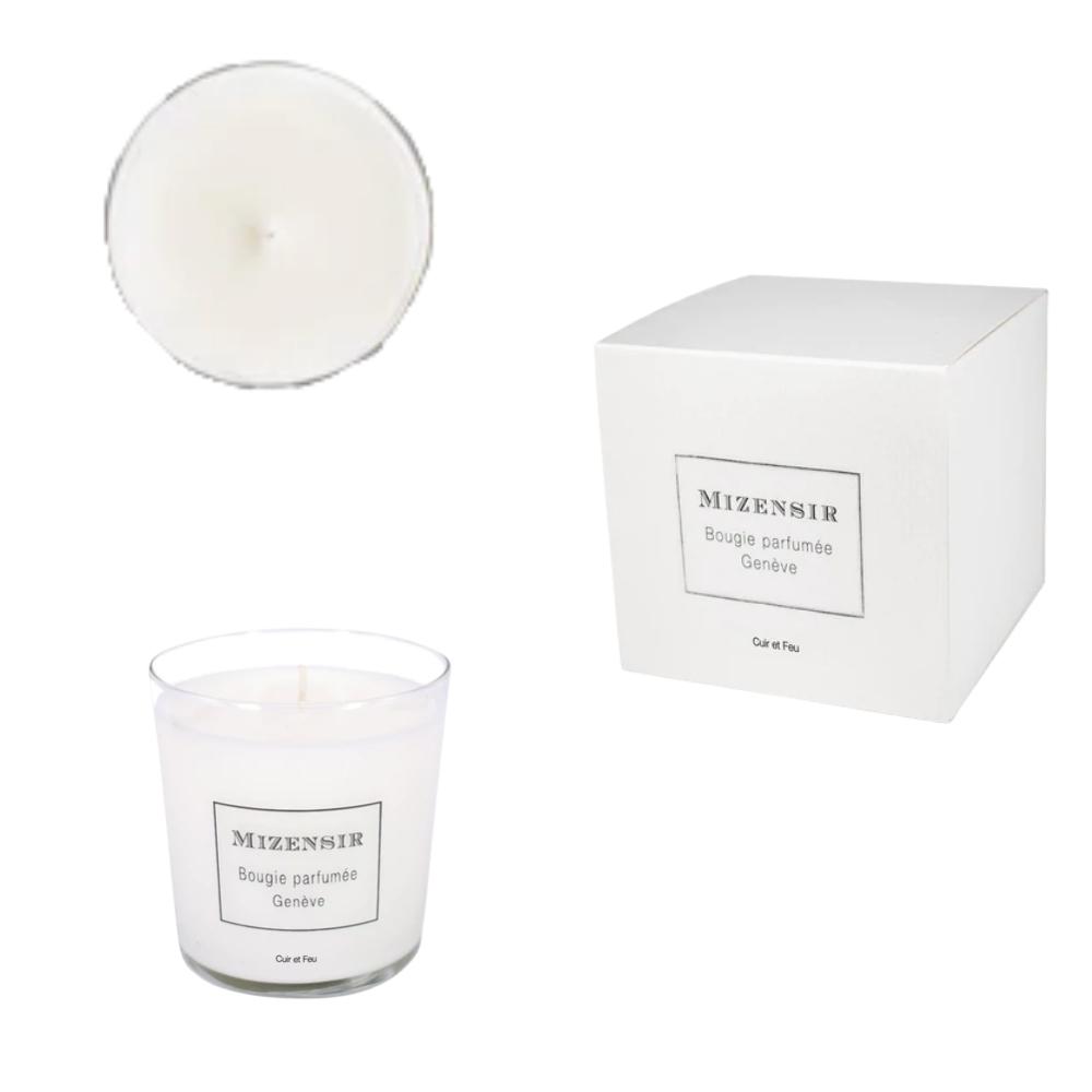 MIZENSIR Cuir et Feu Candle 230g,the evocation of a blazing fire in the heart of a dacha. Where in the darkness of the forest, some steamy, wooded, and amber scents gather to warm the blend, featuring a refined finishing of blond tobacco notes