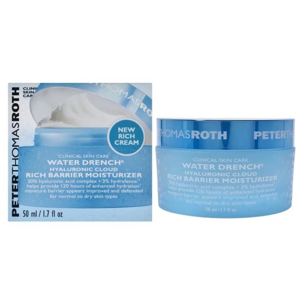 Water Drench Hyaluronic Cloud Rich Barrier Moisturizer is a rich, hydrating moisturizer is formulated with a unique blend of botanical and peptide actives to strengthen your skin's moisture barrier defense and combat the drying effects of external dehydrators. Clinically proven to increase the look of skin thickness and elasticity, it's infused with a 30% Hyaluronic Acid Complex along with 3% HydraFence™ technology for 120 hours of continuous moisture recharge.