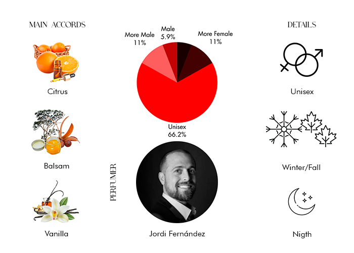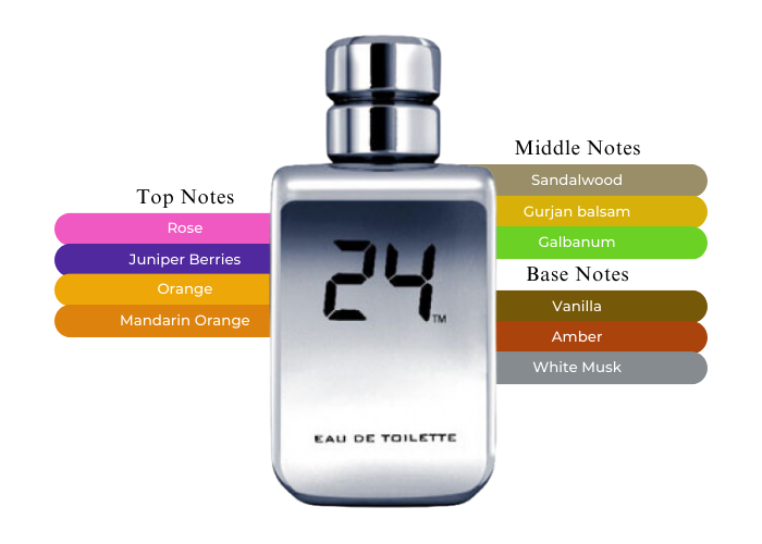 Top notes are rose, orange, mandarin orange and juniper berries; middle notes are sandalwood, gurjun balsam and galbanum; base notes are vanilla, amber and white musk.