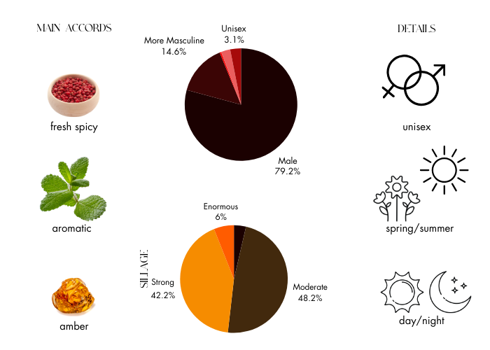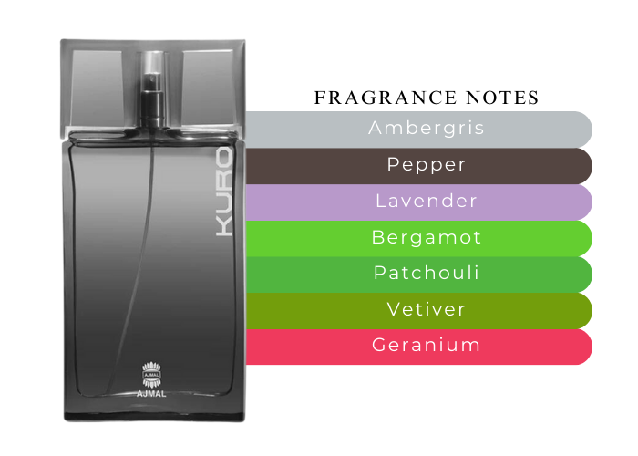 Fragrance notes are Bergamot, Pepper,Geranium, Lavender, Patchouli, Vetiver, and Ambergris.