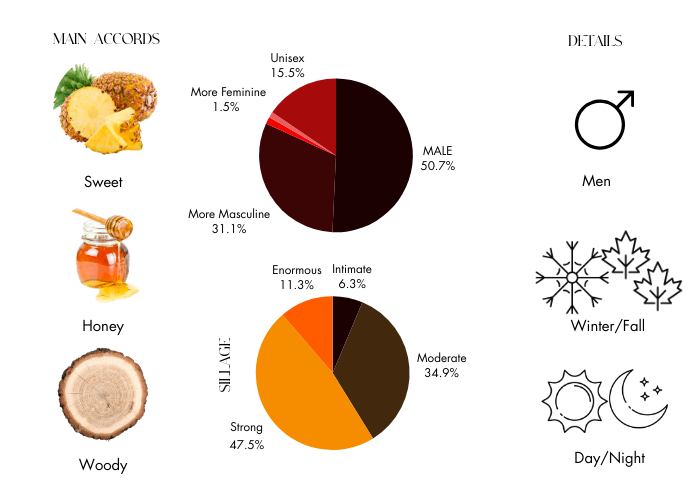 • Base notes are Oakmoss, Leather and Vetiver