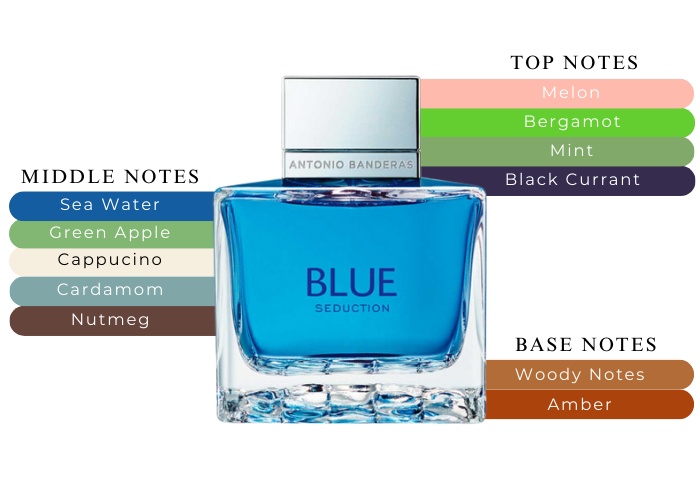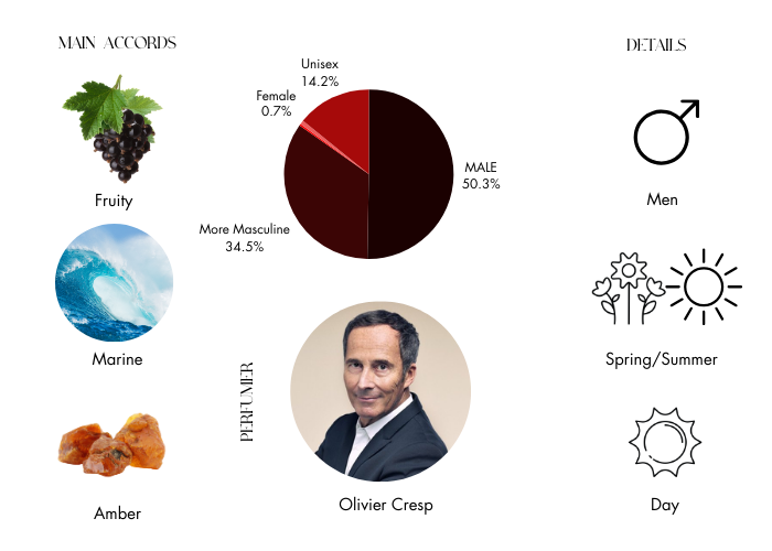 It features bergamot, cassis, mint, melon, cardamom, nutmeg, ocean accord, apple, cappuccino accord, oak moss, woods and musk.