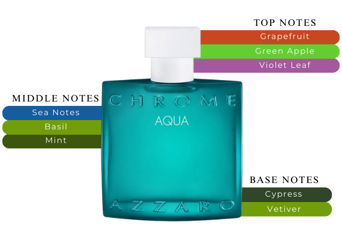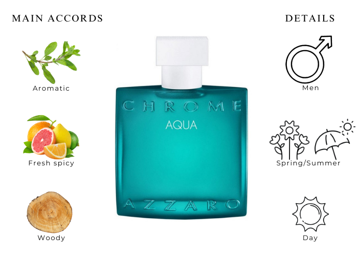 Chrome Aqua Cologne by Azzaro, Chrome Aqua is a men's aromatic aquatic cologne with green, marine, fresh spicy, and woody main accords. It's an ideal scent for summer day wear. Opening this fragrance are head notes of green apple, grapefruit, and violet leaf. The heart notes are sea notes, mint, and basil. Base notes of cypress and vetiver close this composition. Launched in 2019, this scent was created by perfumer Jean-Christopher.