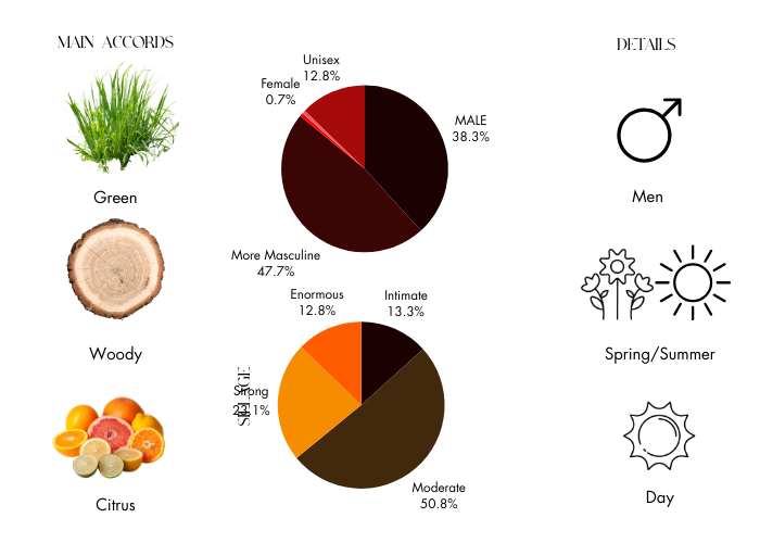 • Base notes are Cedarwood, Sandalwood and Vetiver.