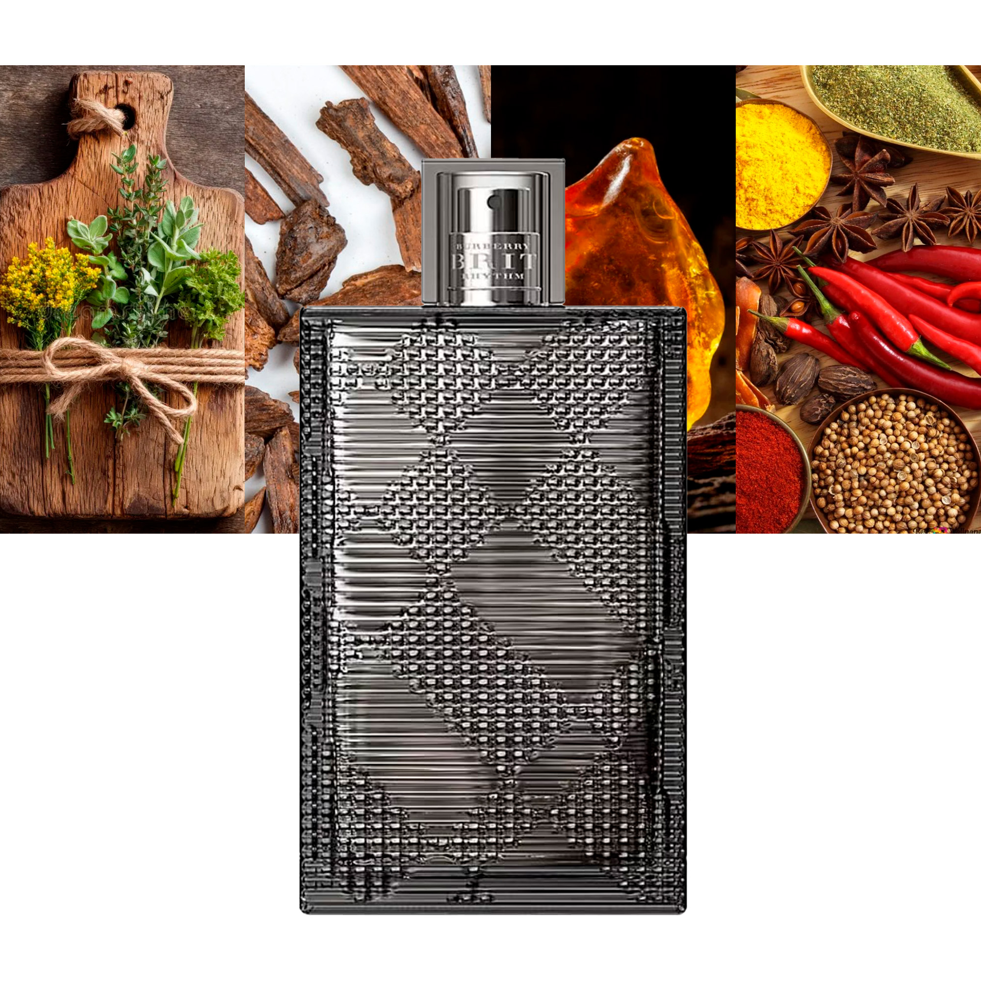 Burberry Brit Rhythm For Him Eau de Toilette .This Perfume is a mixture of basil, verbena, cardamom , juniper berries, leather, patchouli , styrax,cedar, incense and tonka bean.