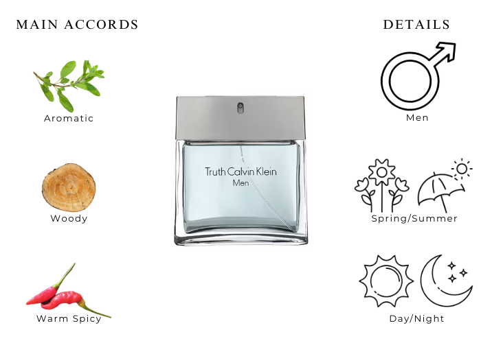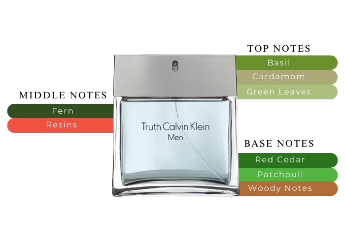 Truth by Calvin Klein For Men is a mixture of patchouli and pepper; middle notes are sandalwood, basil and cardamom; base notes are red cedar and patchouli.