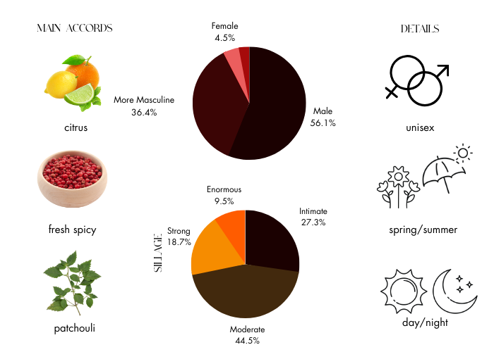 This perfume is a blend of mandarin, bergamot, orange blossom, sage, rosemary, black pepper, patchouli and Guaiac wood.