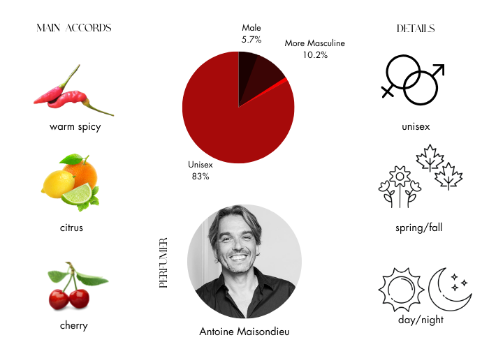 Play Red by Comme des Garcons is a Amber Spicy fragrance for women and men. The nose behind this fragrance is Antoine Maisondieu. This cheery cherry is a totally new interpretation of the note, without a drop of added sugar: it takes the “tart” out of the pie, sticks it back in the tree, and is guaranteed to raise the big goofy grin you'd get if you were a kid let loose on an orchard. PLAY RED composed of the following notes: red mandarin, pink pepper, Safraleine, red cherry, geranium, cinnamon, osmanthus, myrrh and tolu balm.