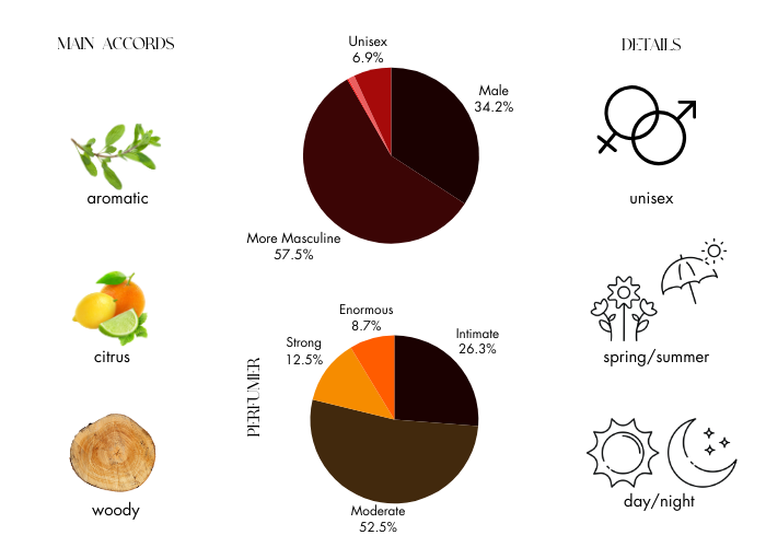 Fragrance notes are Grapefruit, Coriander, Basil, Cardamom, Lavandin, Geranium, Clary Sage, Vetiver, Patchouli, Labdanum, Tobacco.