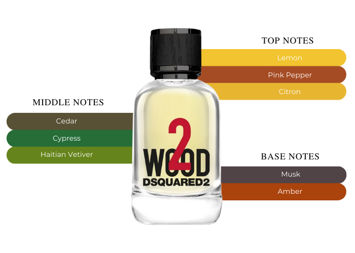 In 2021, the DSQUARED² Wood collection is joined by a gender-neutral, unisex edition 2 Wood. TWO WOOD invites you to experience concept of "born in Canada, designed in London, made in Italy". 2 Wood is described as a lively, fresh and energetic scent of woods, citrus and musk. Top notes: lemon, Primofiore lemon, pink pepper Heart: vetiver from Haiti, cedar, Nootka cypress, silver fir Base: vegetal amber, musk, Vulcanolide