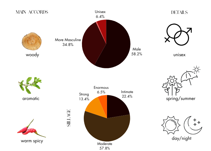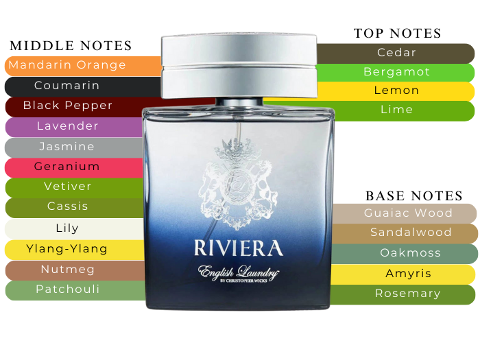 Fragrance notes are lemon, bergamot, lime, cedar, jasmine, patchouli, vetiver, lavender, mandarin, nutmeg and coumarin.