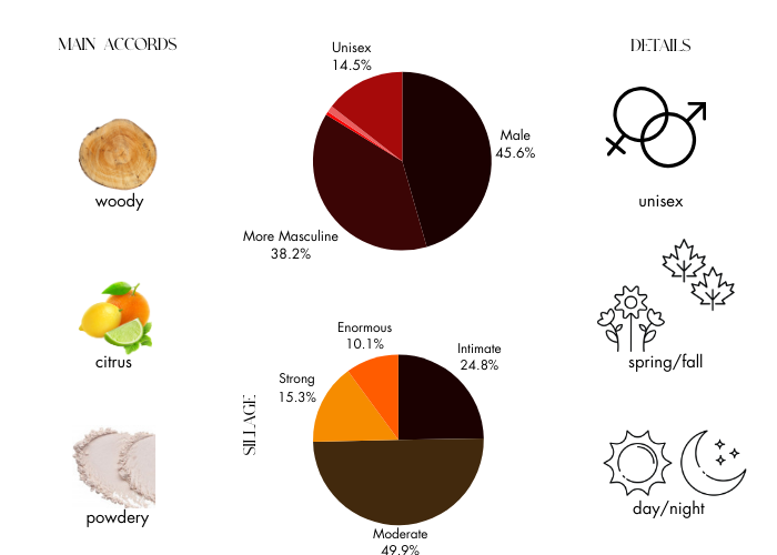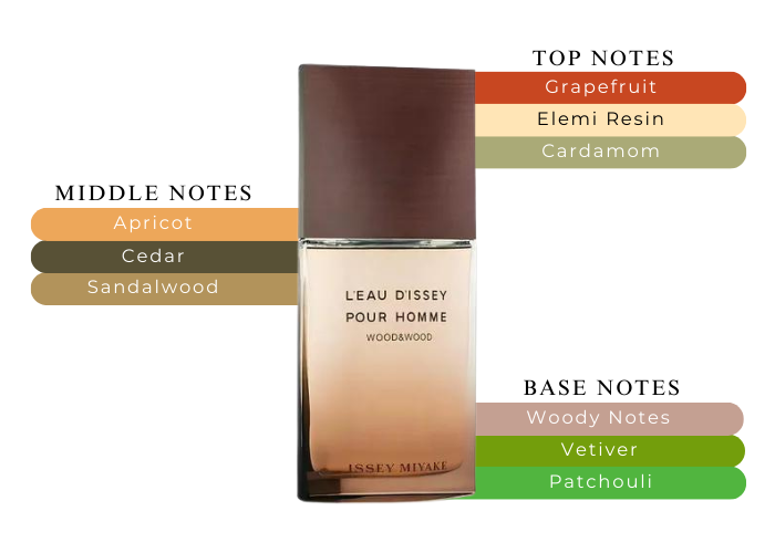 Top notes are Grapefruit, elemi and Cardamom; middle notes are Apricot, Ambroxan, Virginian Cedar and Sandalwood; base notes are Woody Notes, Haitian Vetiver and Patchouli.