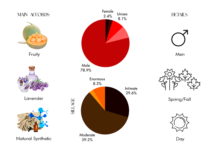Fragrance notes are Bergamot, Melon, Pink pepper, Elemi resin,Apple, Lavender, Sage, Geranium,Vanilla, Vetiver, Patchouli, Cashmeran.