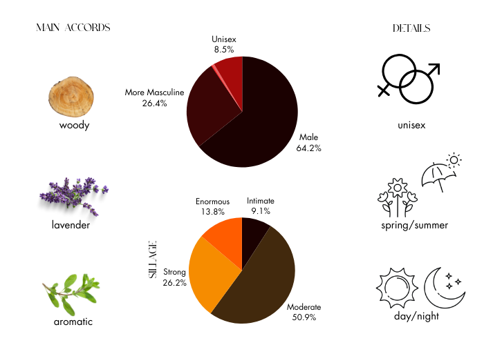 This perfume is vetiver, musk, neroli, Virginia cedar, incense, rose, lily-of-the-valley, red apple and pepper.