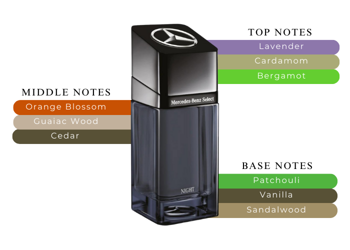 Mercedes Benz Select Night Cologne by Mercedes Benz, Enjoy the elegance and mystery of the late night hours in the city when you're wearing the dapper Mercedes Benz Select Night. This bold men's fragrance boasts spicy, woody and balsamic accords for a rich and robust aroma that can leave you feeling confident from the first step out of your classy ride. Top notes of cardamom, lavender and bergamot introduce the scent with a revitalizing tone, while middle notes of orange blossom, guaiac wood and cedar incorporate a smooth, seductive hint of earthy pleasantry. Finally, base notes of vanilla, patchouli and sandalwood round out the elixir with a creamy soft sensuality that lingers on your skin from the first drink to last call.