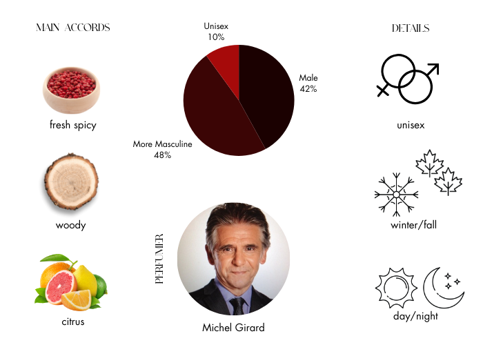 Fragrance notes are lavender, pepper, bitter orange, nutmeg, caraway, cedar, agarwood (oud), guaiac wood and marzipan.