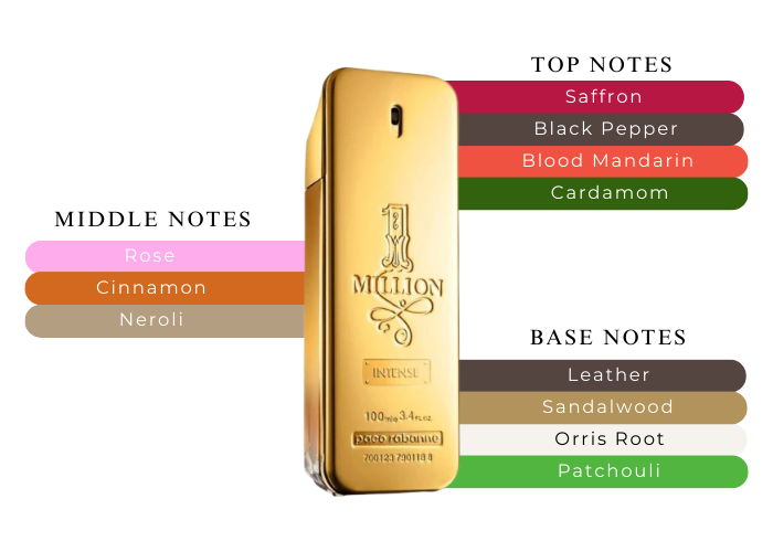 Million Intense Cologne by Paco Rabanne, This is the newest version of the original 1 million cologne for men . Launched in 2013 it is a spicy, woody, oriental scent with top notes of blood mandarin, cardamom, black pepper and saffron. The middle notes are rose absolute, neroli and cinnamon. The base notes are white leather, orris root, patchouli and sandalwood.