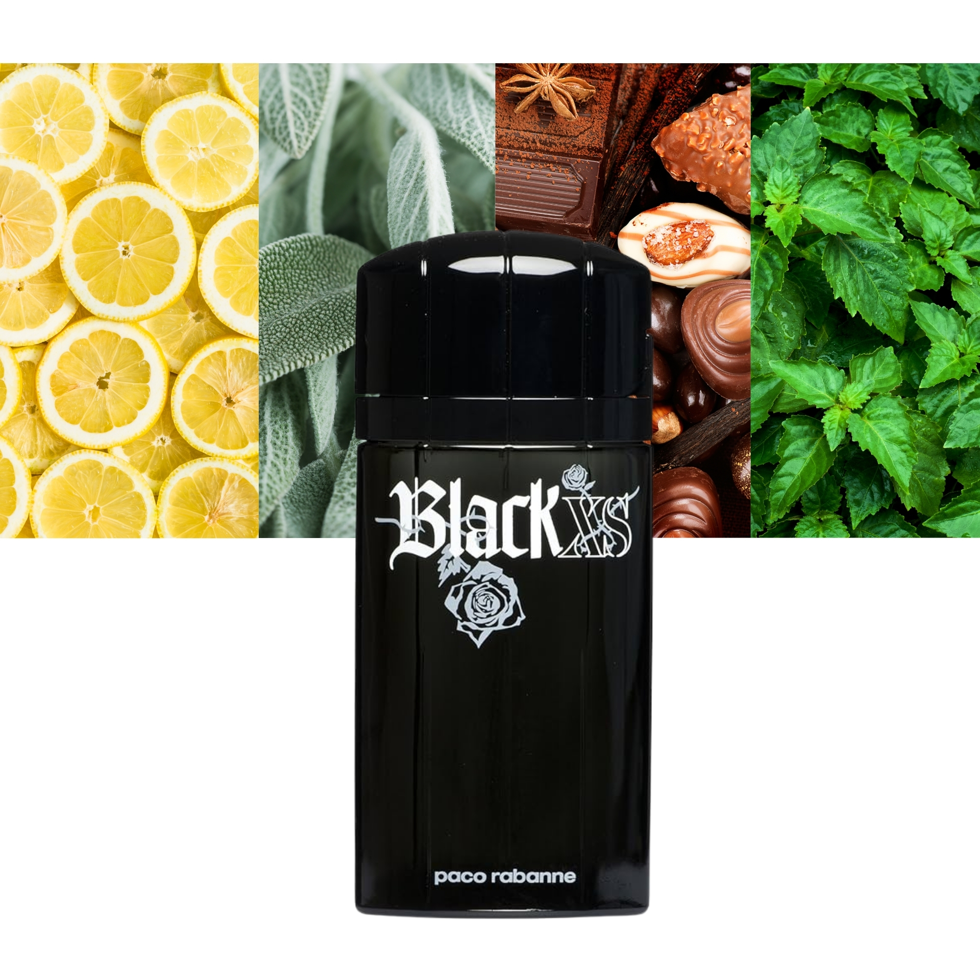 Black Xs by Paco Rabanne for Men , this spicy and aromatic fragrance is a blend of Lemon, Kalamanzi Fruit, Tagetes, Sage, Praline, Cardamom, and Cinnamon.