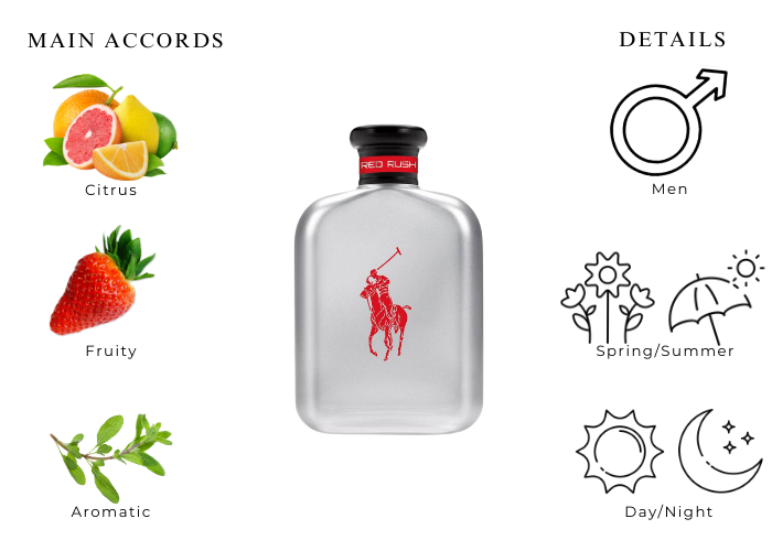 Polo Red Rush is a fresh, masculine scent, featuring citrusy top notes of red mandarin, grapefruit and lemon lifted by sweet, tropical pineapple. Heady base notes of cedarwood and deep red coffee blend with pungent heart notes of spearmint and red saffron, with hints of lavender and orange blossom to round out the spicy accord. The cologne is packaged in a silver version of the company's sleek, signature flask and features the well-known Polo logo in scarlet. Atop the sophisticated bottle sits a deep black stopper that is wrapped in a thin, crimson ribbon bearing the scent's name.