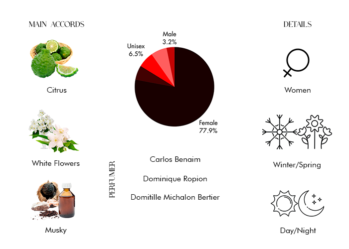 Indulge your senses in the exquisite blend of floral notes, where the delicate essence of jasmine, rose, and orchid intertwines with hints of luscious patchouli and musk, creating an olfactory masterpiece that resonates with passion and romance.