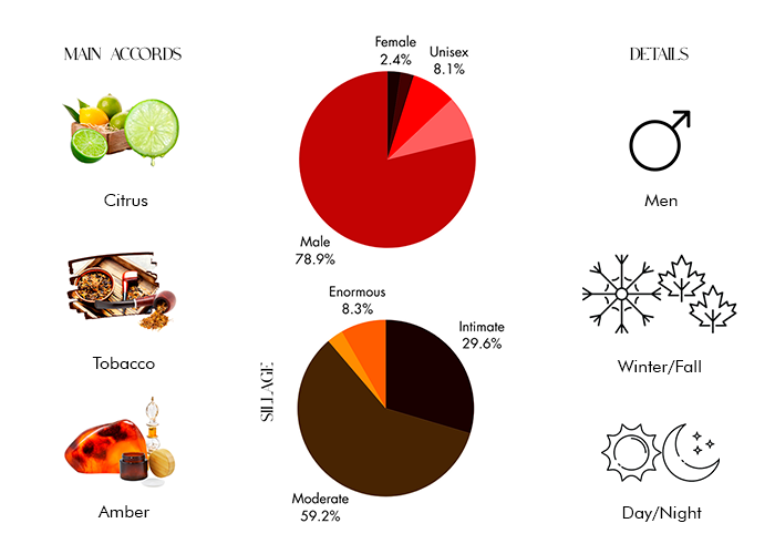 Intense masculine notes with seductive and bewitched character combine freshness and depth in a unique way. Ginger and pink pepper are credited for the sparkling opening of the composition, combined with the typical lemon and grapefruit eau de cologne. The heart of the composition includes an aromatic transition to the intoxicating, smoky and seductive notes, combined with lavender honey and white tobacco. The base keeps the notes of warm wood, amber and sensually warm and cuddly tonka.