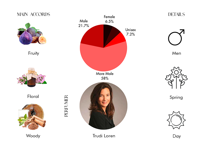 It's a woody - fruity composition, contains notes of fig, clary sage and sandalwood.