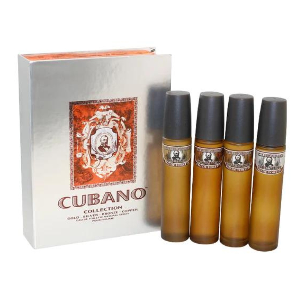 Cubano/cubano 4 Pc. Collection Set (men): CUBANO GOLD EDT SPRAY 2.0 OZ CUBANO SILVER EDT SPRAY 2.0 OZ CUBANO BRONZE EDT SPRAY 2.0 OZ CUBANO COPPER EDT SPRAY 2.0 OZ IN GIFT BOX