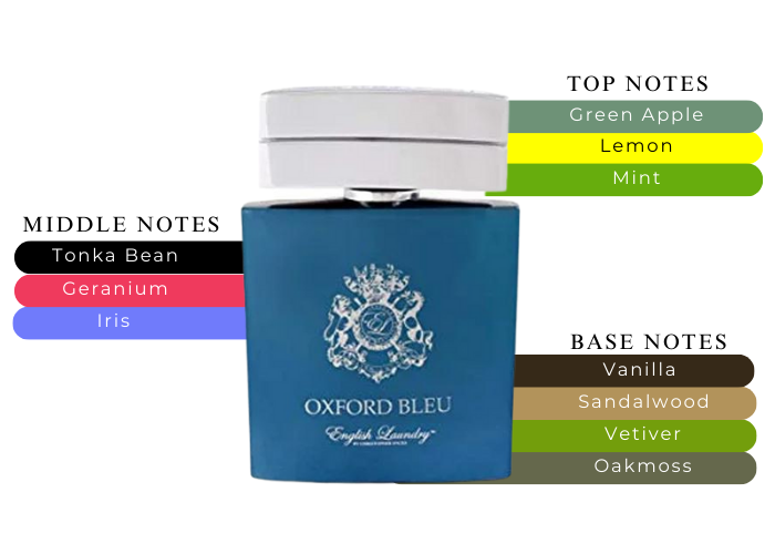 Fragrance notes are mint, green apple, lemon, iris, tonka bean geranium, vetiver, vanilla, sandalwood, oakmoss.