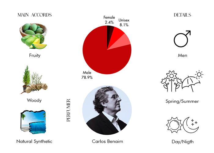 "This majestic cologne combines fruity, herbal, green and marine accords for a crisp and sophisticated scent that leaves you feeling endlessly invigorated. Top notes of bergamot, grapefruit and green mango immediately set the tone with their sweet, tropical nature, while heart notes of geranium essence, clary sage and sharp cypress leaf infuses a cool, fresh atmosphere. Finally, base notes of fir resin, ambroxan, patchouli, musk and various sea notes create a sensual yet airy combination for an altogether bold, riveting cologne you can wear from morning until night with absolute confidence."