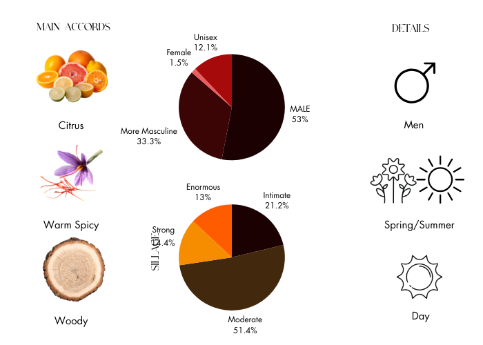 Fragrance notes are citruses ,mint Bourbon pepper , saffron, patchouli and cedar.