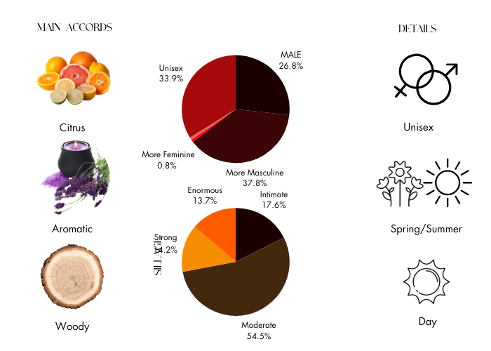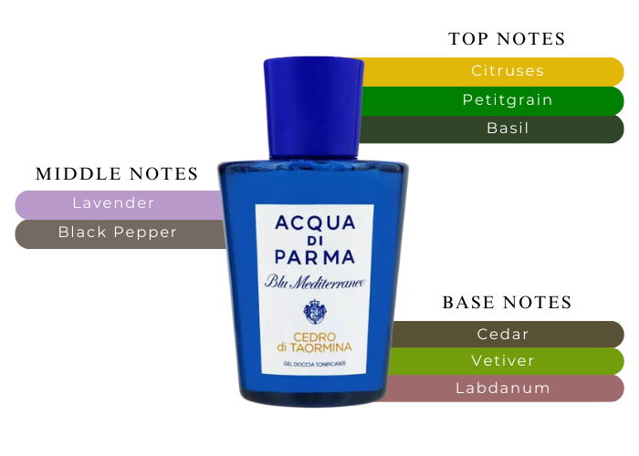 The Fragrance notes are fresh citrus, petitgrain, aromatic basil, black pepper, lavender, cistus labdanum, vetiver, and Virginia cedarwood.
