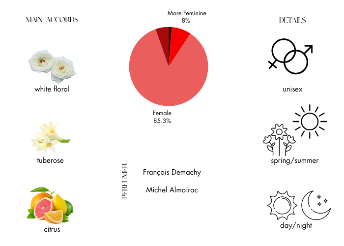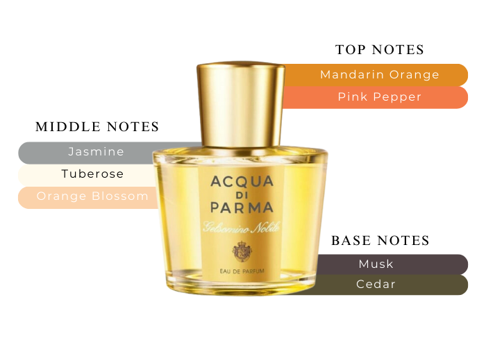 Top notes are mandarin orange and pink pepper; middle notes are jasmine, tuberose, and orange blossom; base notes are musk and cedar.