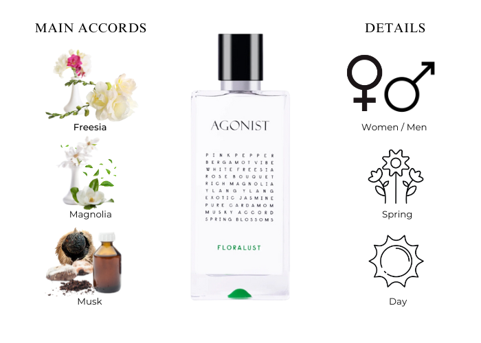 Do you like Floral mixed with Fresh scents? The Floralust Agonist Perfumes is for you. Floralust perfume for ladies and men wants to take you on a magical journey of fresh, cool, and spicy scents.