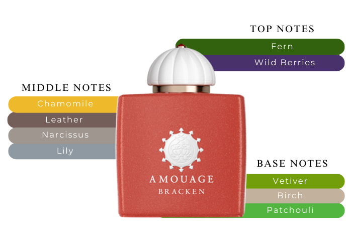 Fragrance notes are Bracken accord, wild berries, lily, narcissus, chamomile, smoky leather accord, patchouli, vetiver, and birch.