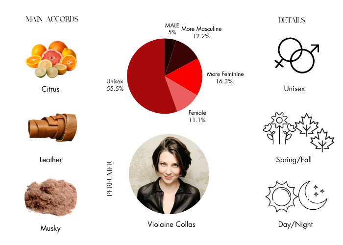 As with any leather fragrance, this perfume has a slight musky feel with a hint of woodsy undertones. The suede note is paired with pineapple that create a rich blend that is incredibly soft and sensual.