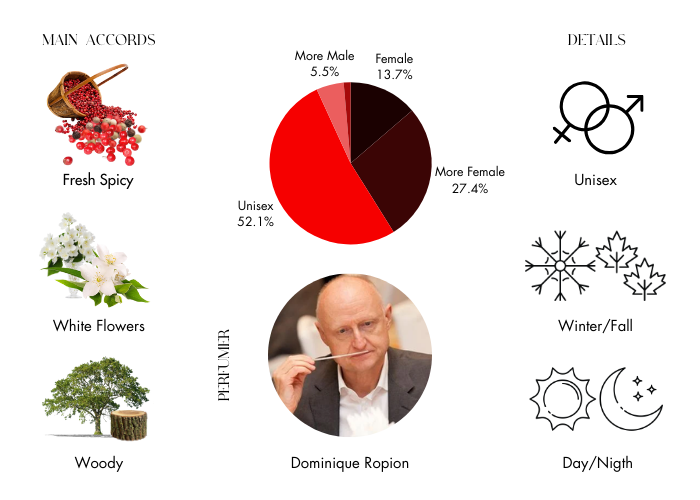 - Base Notes: Bourbon Vanilla, Orris, Benzoin, Leather, Oakwood and Indonesian Patchouli