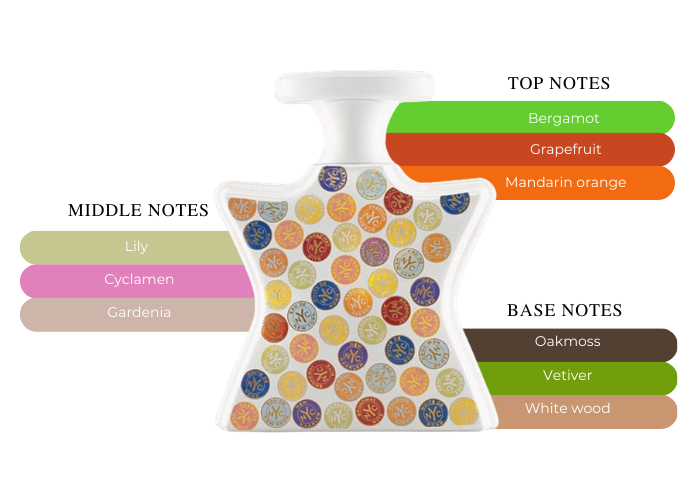 Eau de New York by Bond No.9 is a Blend of grapefruit, mandarin orange, bergamot,watery ncyclamen, lily, gardenia, basil, jasmine, lemon verbena , musk, oakmoss, vetiver and white wood.