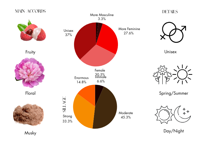 - Cassis, Mandarin Orange, Ambrox, Praliné, Water Lily, Jasmine, Oakmoss, Patchouli, Peach Musk, Peony, Vanilla and Lychee