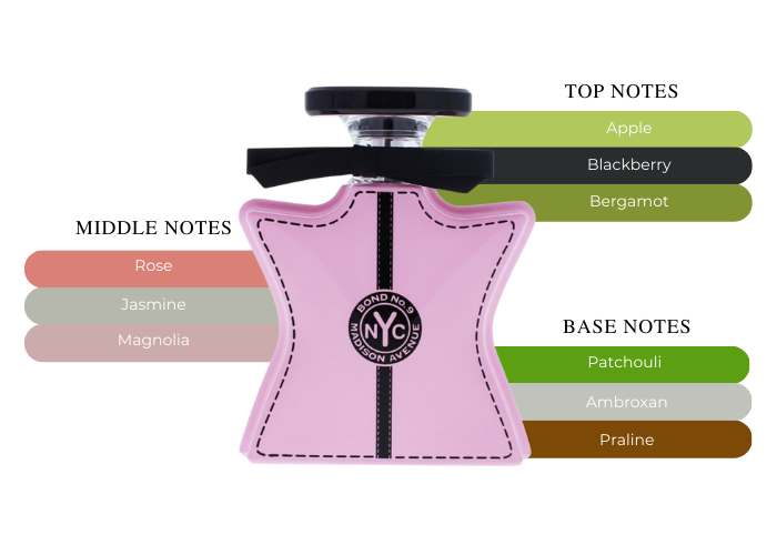 Bond No. 9 introduces the world's first shopping scent - just for you. It's named Madison Avenue, after New York's most celebrated street of boutiques. TOP NOTES Apple Bergamot essence Blackcurrant HEART NOTES Rose essence Jasmine Magnolia essence BASE NOTES Patchouli essence Ambroxan Praline