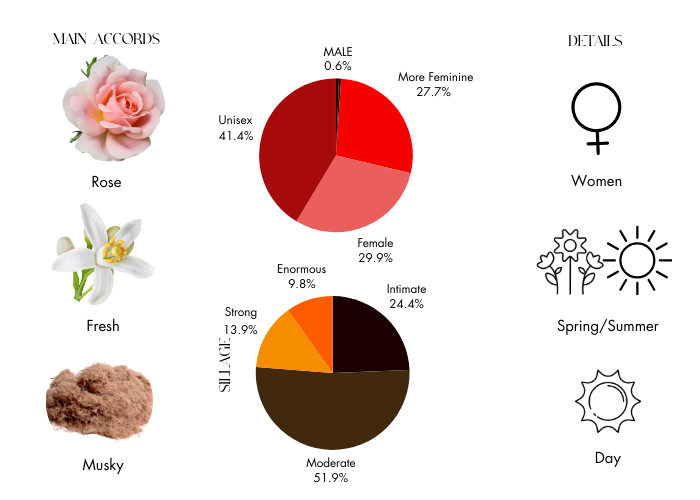 With its delicate blend of rose centifolia, this fragrance envelops you in an aura of softness & grace. As the scent dances on your skin, the subtle hints of peony & violet add a touch of complexity & allure, as the fragrance settles, the base notes of sandalwood and musk create a smooth and lasting impression.