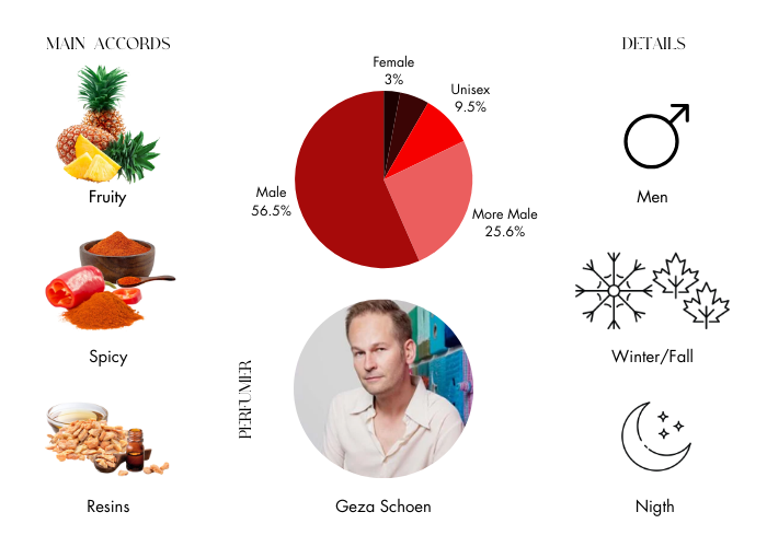 - Base Notes: Cedarwood, Oakmoss, Tree Moss, Vetiver and Vanilla