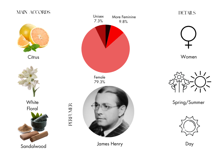 Fragrance notes are bergamot,Bulgarian roses, Florentine irises,ambergris infusion.