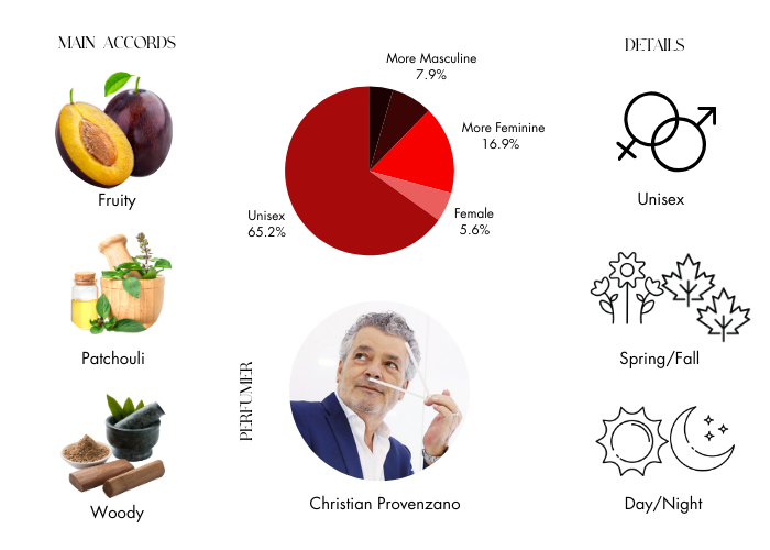 This delightful woody amber perfume enters with a fresh and elegant cardamom, lightly laced with plum and pomegranate before opening into a heart of Egyptian jasmine, a fresh, aromatic, clean patchouli and a tint of rose.