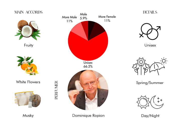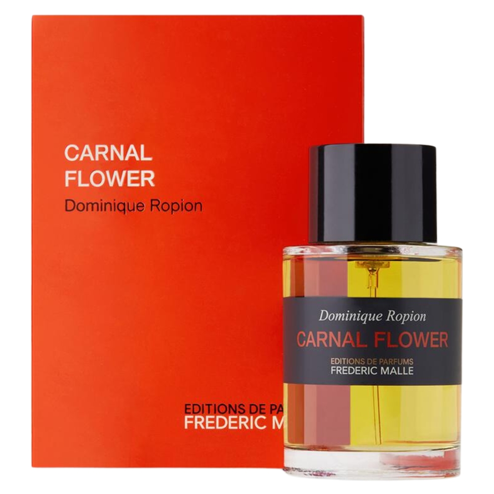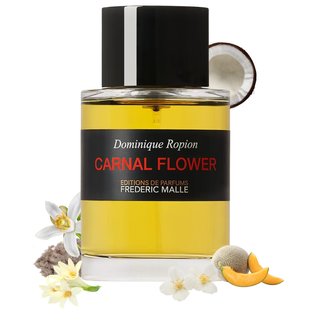 Carnal Flower Perfume by Frederic Malle, Containing a uniquely high concentration of natural tuberose oil, Carnal Flower is an intensive white floral fragrance that layers fresh and lush tropical tones over a sensual sheer musk base. The opening is a bright and green effusion of citrus leaves, delicately fruity-aromatic bergamot and mouthwatering cantaloupe underscored by clean, camphoric nuances of eucalyptus. A sensual, spicy tuberose and jasmine accord dominates that heart notes, softened by banana-toned ylang-ylang. The finish is an intoxicating, comforting blend of coconut and white musk laced with orange blossom and tuberose absolute.