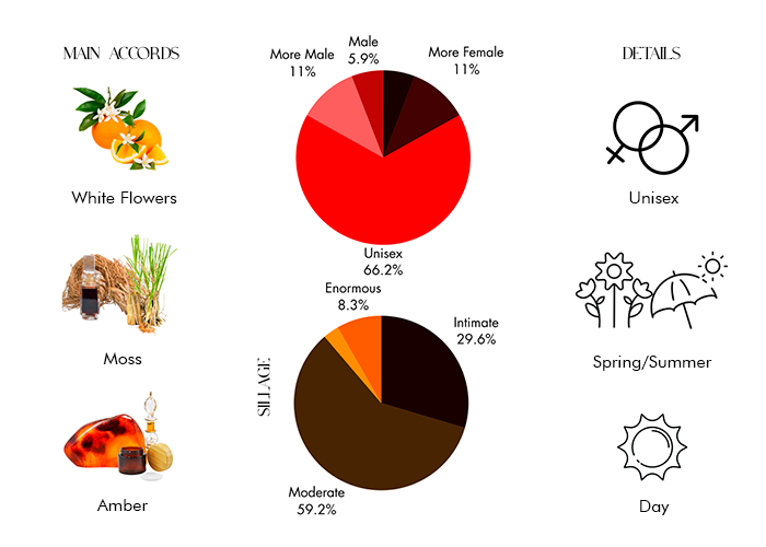• Orange Blossom Absolute, Amber, Madagascan Cinnamon, Mandarin Orange, Tonka Bean, Ylang-Ylang, Bergamot, Jasmine, Musk, Neroli, Plum, Sandalwood, Vanilla, Vetiver and Patchouli