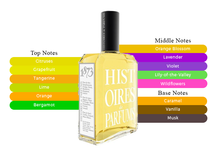 1873 by Histoires de Parfums is a Citrus Gourmand fragrance for women. 1873 was launched in 2001. Top notes are Citruses, Grapefruit, Tangerine, Lime, Orange and Bergamot; middle notes are Orange Blossom, Lavender, Lily-of-the-Valley, Wildflowers and Violet; base notes are Caramel, Vanilla and Musk.