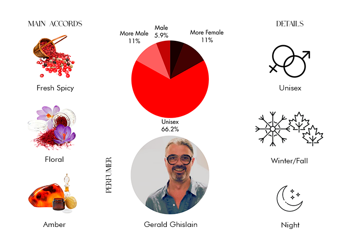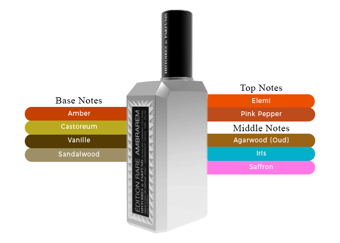 Fragrance notes are Pink Peppercorn, Elemi, Iris Absolute, Oud, Saffron, Castoreum Absolute, Bourbon Vanilla, Sandalwood, & Amber. Made in France .