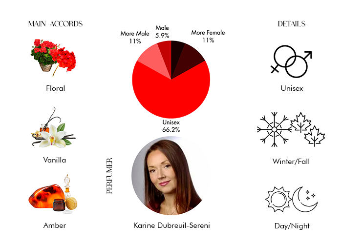 Fragrance notes are Cinnamon, pepper, cardamom, nutmeg, amber, vanilla, rose, patchouli, sandalwood, benzoin, tonka bean.